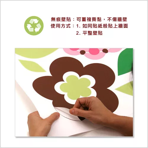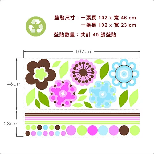 想像身旁簇擁著美麗的盛開花朵,微風拂來只聞到淡淡花香與隨風搖曳的五彩繽紛,心情頓時開朗愉悅。此款美國原廠設計、生產的壁貼強調可重複撕黏使用,不破壞壁面,方便您隨意更換居家氛圍。使用方式簡易,如同貼紙般撕下並平整於牆面即可。適合妝點於客廳、書房等空間。全組共4朵花色共45張壁貼組成隨您搭配運用。